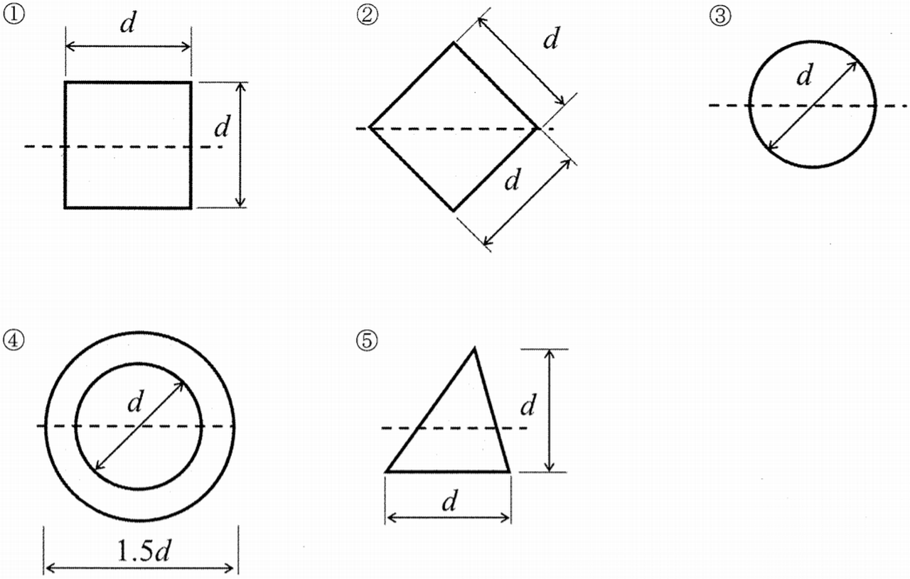 下図の各断面のうち, 点線で示す図心軸まわりの断面二次モーメントの値が最も大きくなるものはどれか。